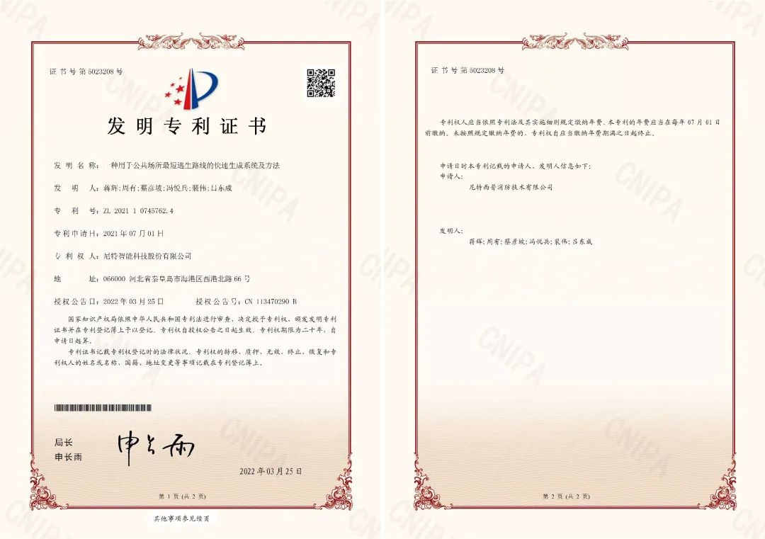 基于強大的技術研發優勢和完整的應急疏散系統,尼特自主發明的“一種用于公共場所最短逃生路線的快速生成系統及方法”是依據路線上的傳感器探測到的火警情況判斷該路線的危險程度,通過比較不同路線的危險程度判斷逃生的方向,實時地調整指示燈具的指示方向,準確篩選出不同地方著火時的最短逃生路線,減輕了編制疏散預案的工作量,降低了難度和出錯的可能性,同時可避免將人員疏散至危險較大的地方,在快速生成最短逃生路線、有效節省逃生時間的前提下,最大程度上減少人員的傷亡率。