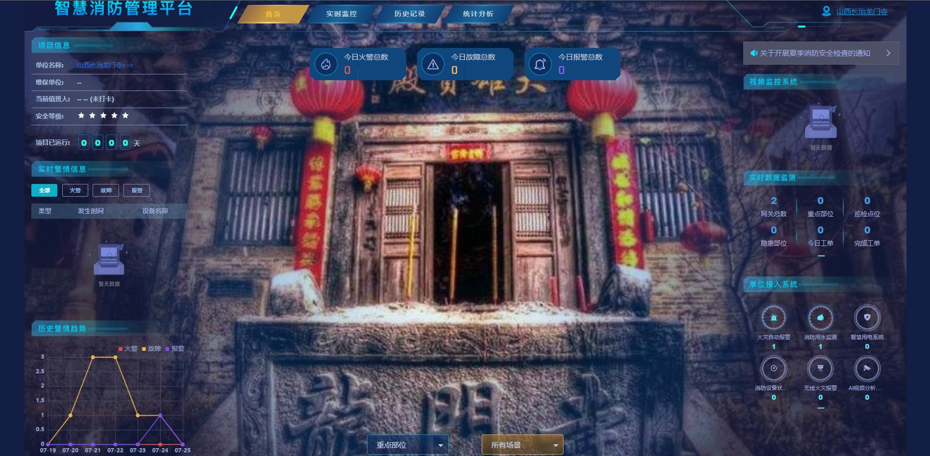 通過用戶信息傳輸裝置與寺內(nèi)火災(zāi)自動報警主機(jī)進(jìn)行對接,實(shí)時采集各種火災(zāi)報警、建筑消防設(shè)施運(yùn)行狀態(tài),將原本各自獨(dú)立使用的消防各系統(tǒng)和設(shè)施“物聯(lián)”,盡早預(yù)判安全隱患及危險源,極大提高龍門寺消防安全管理能力。