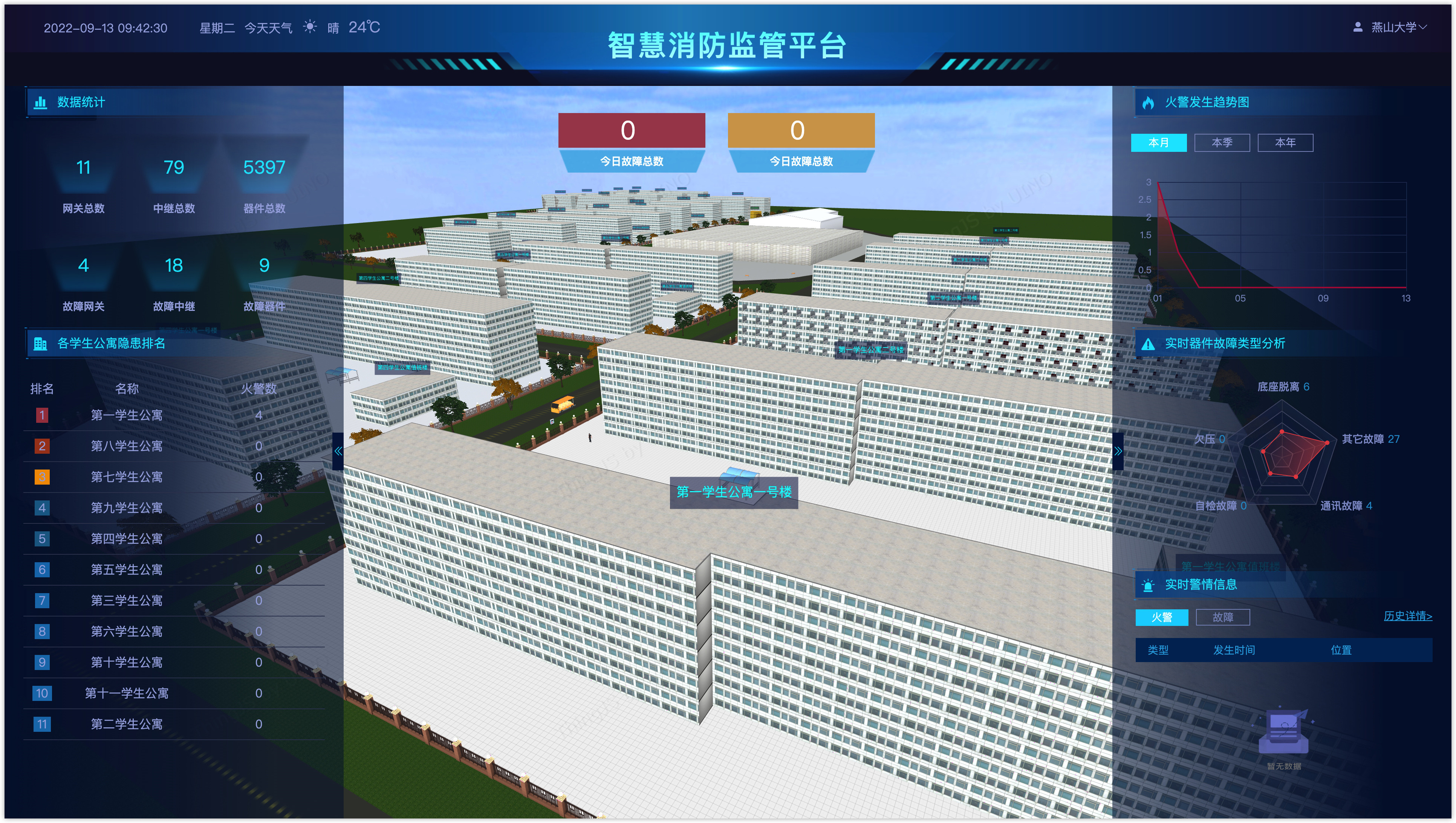 為更好實現學生公寓消防安全集中管理,尼特為燕山大學量身定制了三維可視化消防管理平臺,助力燕大大學構建多層次、多功能、反應迅速、信息共享的安全體系,可全天受理預警信息。三維可視化管理界面,可隨時掌握每棟公寓、每間宿舍消防動態,以數據資源為核心,切實提高學生公寓火災監測的實時性和及時性,實現火災防控的智能化和遠程化,促進燕山大學消防管理方式升級。