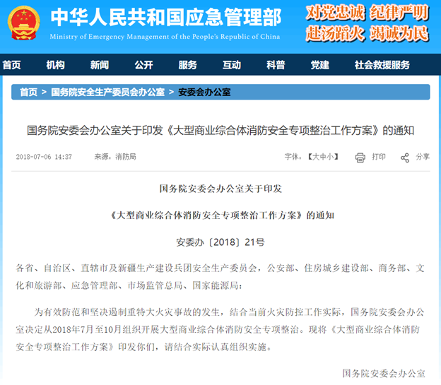 國務院安委會辦公室于2018年印發《大型商業綜合體消防安全專項整治工作方案》,將商業綜合體的消防工作納入重點工作,要做到有效防治和堅決遏制商業綜合體重特大火災事故發生,保障人民生命財產安全。
