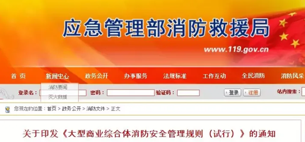 2019年11月26日,應急管理部消防救援局《大型商業綜合體消防安全管理規則》印發,主要目的是推動大型商業綜合體落實消防安全主體責任,提升消防安全管理水平。