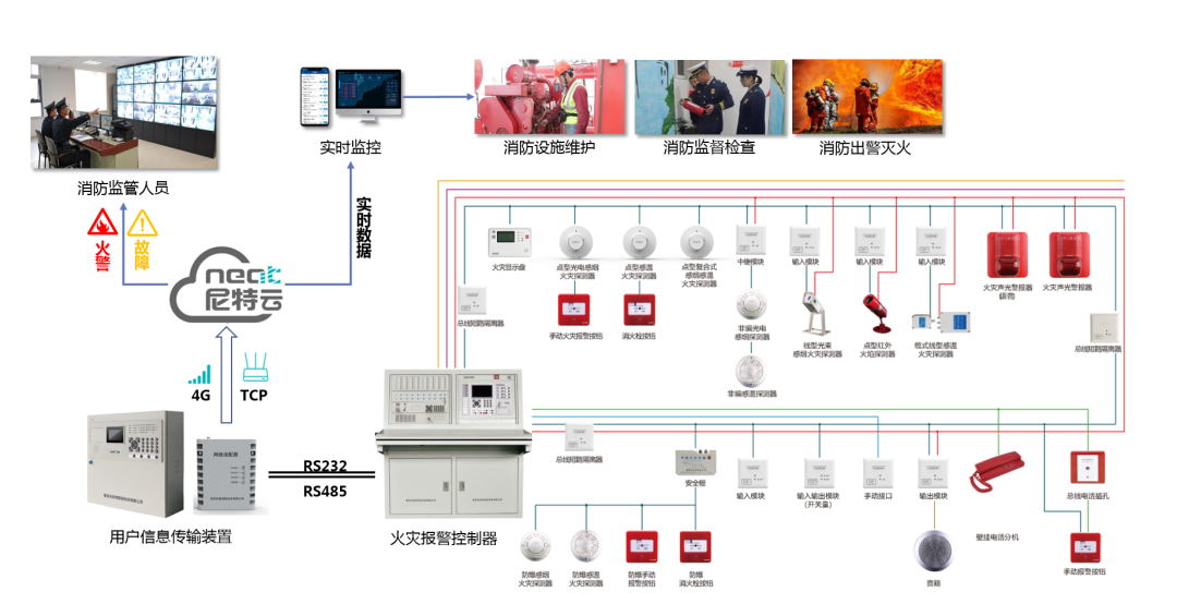 為此,尼特智慧消防充分利用物聯(lián)網(wǎng)信息傳感與通訊技術(shù),自主研發(fā)了兩款用戶信息傳輸裝置,主要負責從火災(zāi)報警控制器中采集消防報警設(shè)施實時運行狀態(tài)信息,實現(xiàn)火災(zāi)報警系統(tǒng)與尼特云智慧消防管理平臺的通訊、數(shù)據(jù)處理等功能。尼特的兩款用戶信息傳輸裝置均支持與各類主流品牌及型號的火災(zāi)自動報警控制相聯(lián)接,并可完成消防設(shè)施的運行狀態(tài)獲取及上傳,將所有數(shù)據(jù)都接入到云平臺進行統(tǒng)一的可視化管理,同時提供Web、App應(yīng)用服務(wù),廣泛應(yīng)用于老舊社區(qū)改造、商業(yè)綜合體、醫(yī)院、機場、文物古建、九小場所等場景,為消防監(jiān)管、通信指揮、滅火救援等消防工作提供更加全面的數(shù)據(jù)支撐。