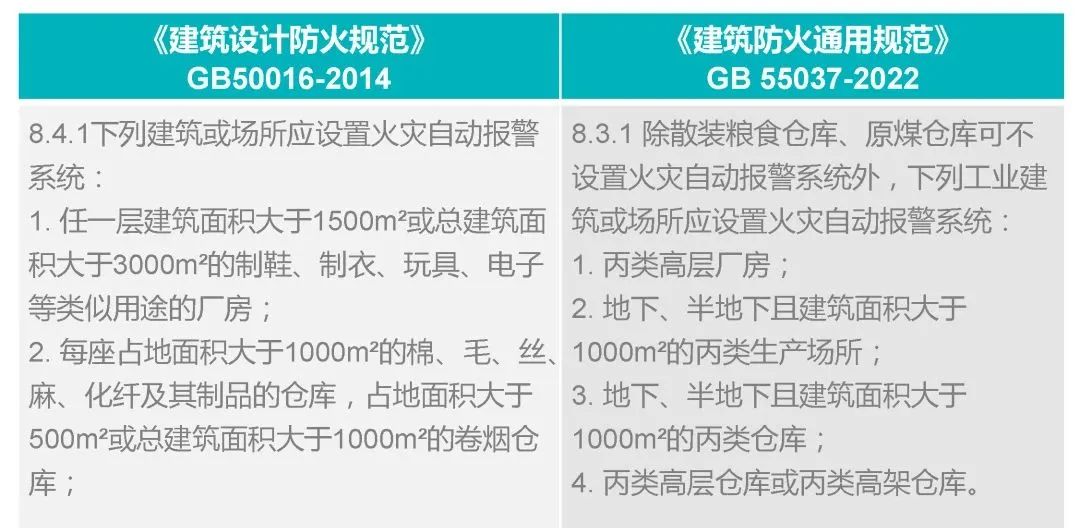 新規(guī)范主要以建筑或場(chǎng)所的消防等級(jí)為依據(jù),對(duì)大于1000m2的地下、半地下丙類生產(chǎn)場(chǎng)所和倉(cāng)庫(kù)及高層廠房、倉(cāng)庫(kù)等丙類建筑設(shè)置火災(zāi)自動(dòng)報(bào)警系統(tǒng)做出了明確規(guī)定,擴(kuò)寬了火災(zāi)自動(dòng)報(bào)警系統(tǒng)在工業(yè)建筑上的應(yīng)用范圍。