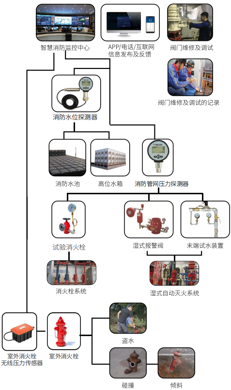 3、對于公共區域的室內外安裝的消防水系統、排煙系統,可以通過消防水位探測器、消防管網壓力探測器以及消防設備狀態監控器實現消防水管網壓力、液位等重要狀態的檢查,同時可以通過遠程巡檢的方式,提高人工巡檢效率,降低成本;