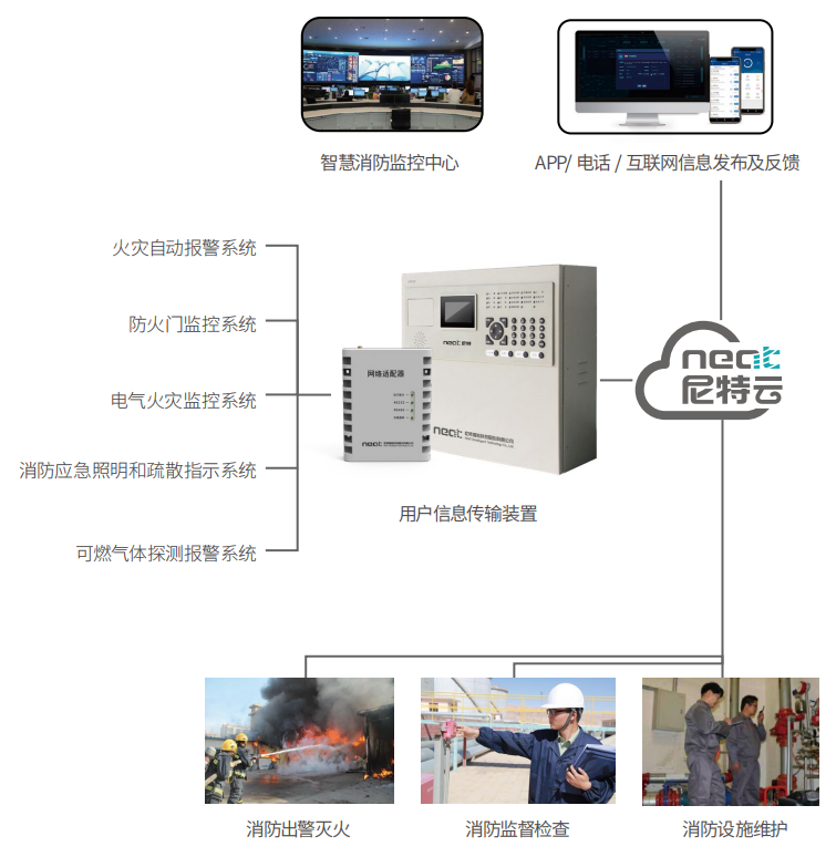 國網供電消防設備五花八門、協議標準各有不同。尼特用戶信息傳輸裝置支持RS232、RS485、CAN等接口,將國網供電原有的火災自動報警系統與智慧消防系統進行對接,實時采集各種火災報警、建筑消防設施運行狀態,并在液晶屏上顯示的壓力、水位、控制柜狀態、消防電源狀態等信息,以AC220V加備電的供電形式以保證數據的穩定傳輸,借助多種信息感知手段實現對國網供電消防安全狀況的全方位感知、全過程監控。
