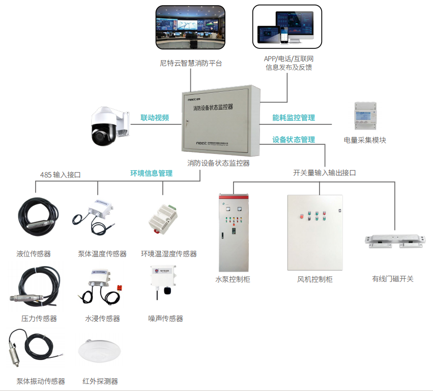 在國網供電的設備機房、風機房、水泵房、電梯機房、配電房等場所安裝尼特消防設備狀態監控器,實時監測消防設備的電源、運行、故障、手自動狀態和控制設備啟停,同時可以對環境中溫濕度、水浸、噪聲、水泵風機振動、水泵表面溫度、壓力、液位等信息進行實時探測,無需安排人力進行現場巡查,減輕了人員巡檢壓力,同時降低了項目管理企業運營的人力及能耗成本,提高了國網供電火災風險應急響應效率。