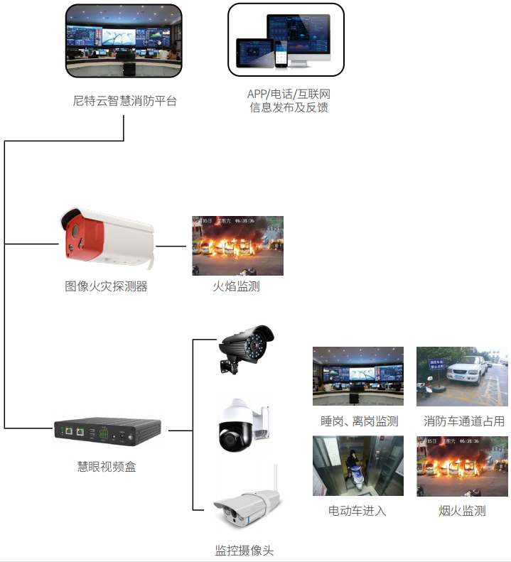 針對室內消防逃生通道、室外消防車道廣泛存在的堵塞和占有的情況,尼特結合視頻AI技術,對于國網供電需要加強火災防控的重要部位,以慧眼視頻盒智能監管建筑內新增或原有的視頻監控,發生火災時聯動展現報警點視頻,實現火點檢測、煙霧識別、逃生通道物品堵塞、消防通道車輛占用、電動車違規充電或停放、消控室人員在離崗、消控室人員持證上崗等智能監測應用,實現國網供電的消防一體化管理。