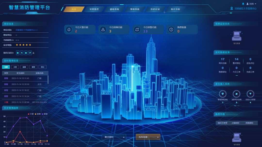 對報警信息進行統計,生成周報、月報、季度報和年報,建立設備的信息化管理流程,將管理日志、運行日志、巡查日志生成電子檔案,實現血液中心消防管理工作的痕跡化。