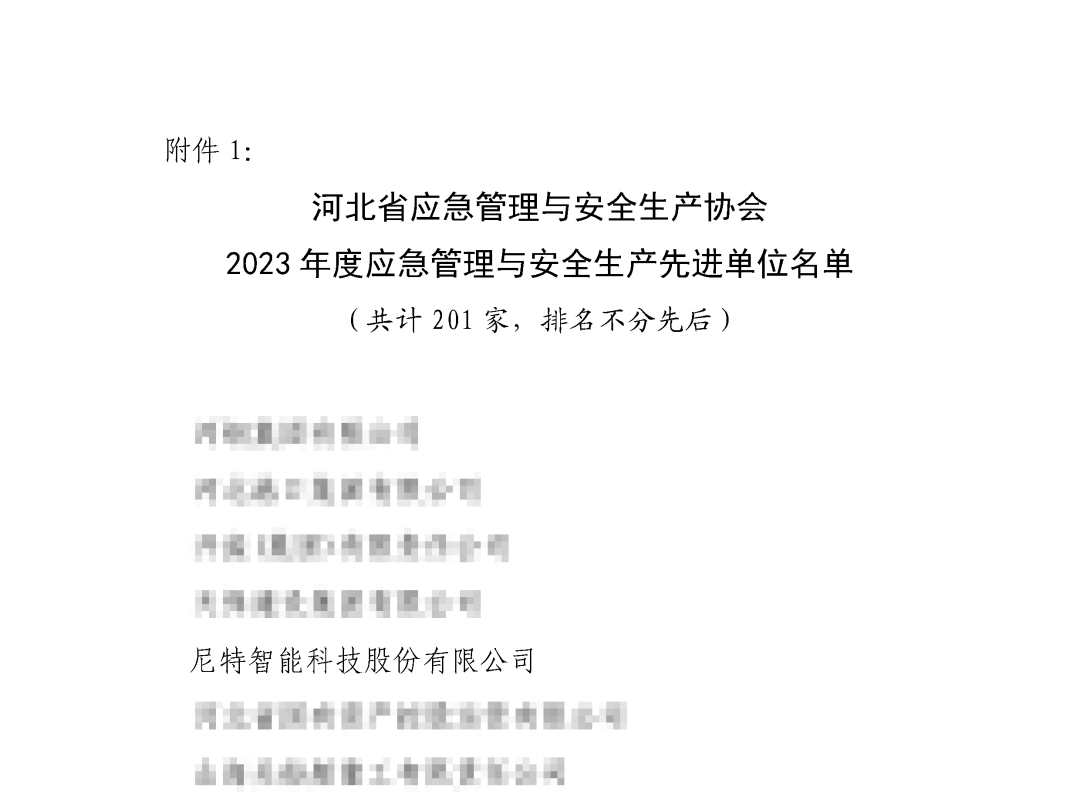 河北省應急管理與安全生產協會開展此次評選致力于表彰認真落實企業安全生產主體責任,重視應急管理與安全生產管理工作的單位和個人,進一步激發各單位安全管理人員的工作積極性和創造性,促進河北省安全生產形勢持續穩定好轉。本次獲得“2023年度秦皇島全市安全生產和應急管理工作先進單位”的榮譽,標志著我公司的安全生產管理水平躍上了一個新的臺階,也意味著公司在安全生產管理工作邁出了重要的一步,是對尼特智能安全工作的肯定,更是一份鞭策!
