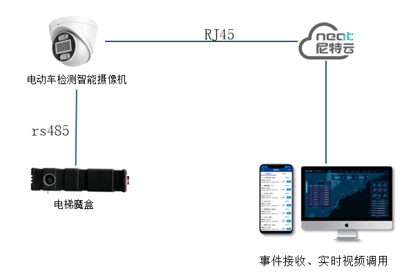 在電梯內安裝電梯相機與電梯魔盒,采集電梯運行方向、故障狀態(tài)、當前樓層、開關門狀態(tài)、樓層號、里程數、速度等信息,當電瓶車抵達電梯,立即識別,不斷發(fā)出語音警報提示禁止電瓶車上樓,且電梯門也無法關閉,直到電瓶車退出電梯才能恢復正常,同時可以通過原有的硬盤錄像機或尼特云智慧消防管理平臺調取監(jiān)控視頻,方便管理及問題追溯。