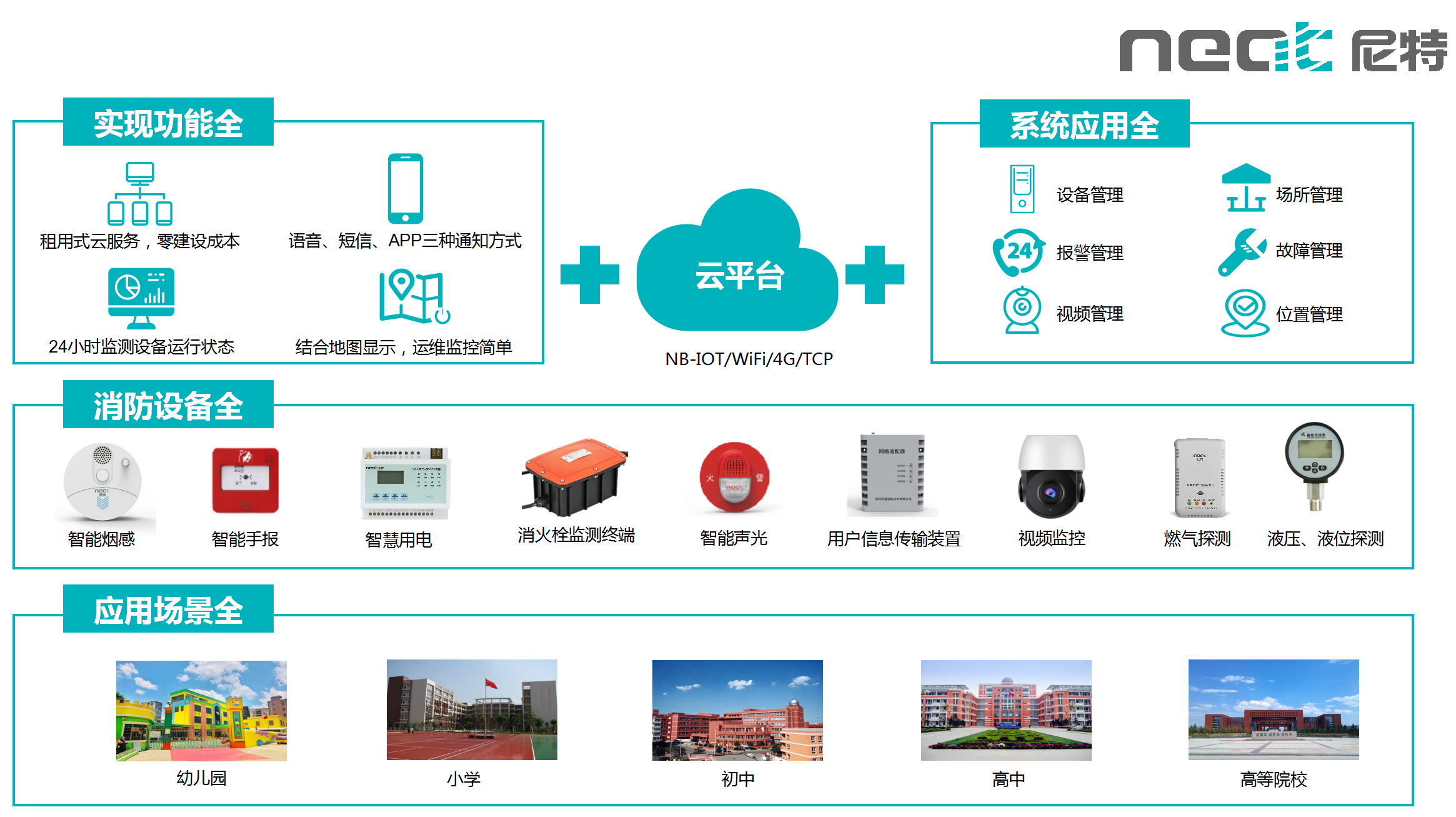 通過(guò)接入尼特云智慧消防管理平臺(tái)、布設(shè)智能硬件終端,實(shí)現(xiàn)集中監(jiān)控、在線監(jiān)測(cè)、點(diǎn)對(duì)點(diǎn)維護(hù),有效提升中小學(xué)、幼兒園的消防管理水平。