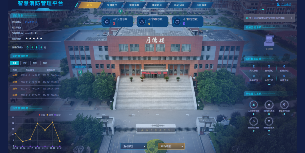 解決方案:針對(duì)學(xué)校基本信息、建筑信息、重點(diǎn)部位信息、消防設(shè)施信息、人員信息等消防相關(guān)信息,建立尼特云智慧消防管理平臺(tái),對(duì)各類(lèi)消防設(shè)施進(jìn)行實(shí)時(shí)監(jiān)測(cè),方便清晰了解校園內(nèi)每個(gè)區(qū)域的消防情況,協(xié)助決策。