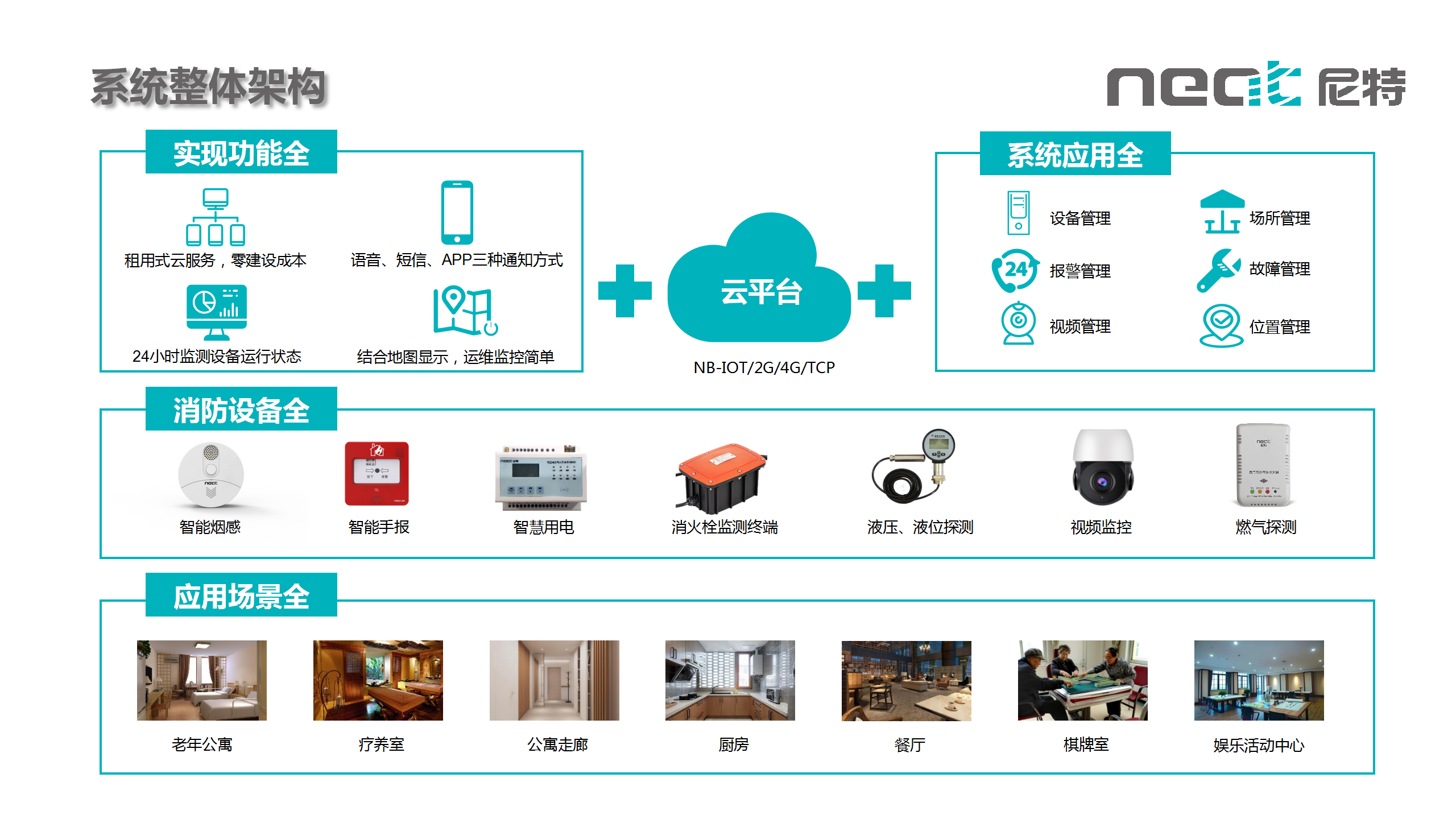 根據(jù)養(yǎng)老機(jī)構(gòu)實(shí)際需求,尼特智能集成無線火災(zāi)報(bào)警監(jiān)測、可燃?xì)怏w探測報(bào)警、電氣火災(zāi)隱患監(jiān)測、消防用水監(jiān)測、AI視頻監(jiān)控等功能,結(jié)合尼特云智慧消防管理平臺(tái),為養(yǎng)老機(jī)構(gòu)的公寓、廚房食堂、老年娛樂活動(dòng)中心等重點(diǎn)區(qū)域打造了從現(xiàn)場數(shù)據(jù)采集到云端處理,再到APP和Web端實(shí)時(shí)監(jiān)控與預(yù)警的智慧消防解決方案。
