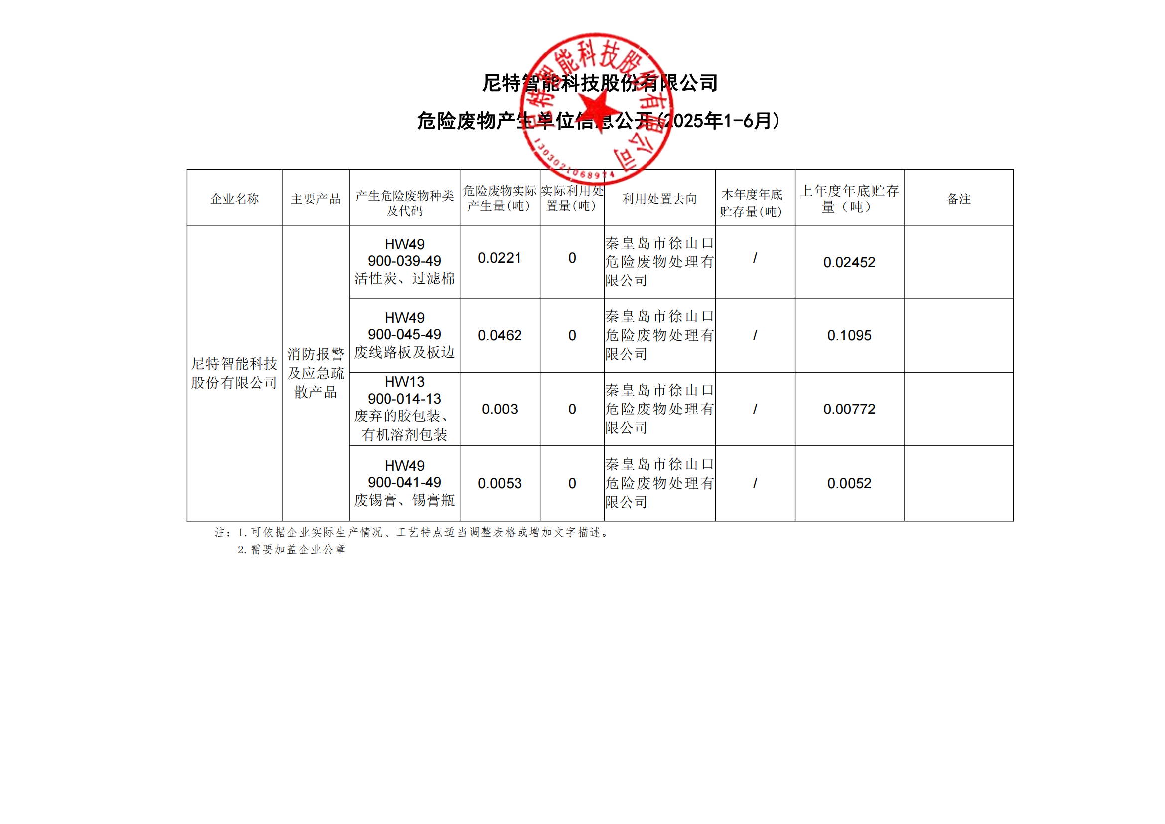 尼特智能科技股份有限公司 危險廢物產生單位信息公開(2025年1-6月)