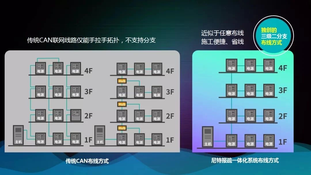 針對項目的以上問題,尼特消防報疏一體化系統(tǒng)能夠更好的滿足項目訴求,系統(tǒng)優(yōu)勢驟顯,一方面,該系統(tǒng)采用全二線制設計,減少近半的布線成本和工作量,同時獨創(chuàng)“三級二分支”布線方式,無需加Hub可自由布線,省工省線省成本;另一方面,該系統(tǒng)實現(xiàn)了火災報警系統(tǒng)和智能疏散系統(tǒng)的高度集成,通過提高砝碼占空比和斜率補償技術(shù),保證了總線的帶載能力和系統(tǒng)穩(wěn)定性,較好地滿足了該項目在節(jié)省成本、方便施工和系統(tǒng)穩(wěn)定性方面的需求!